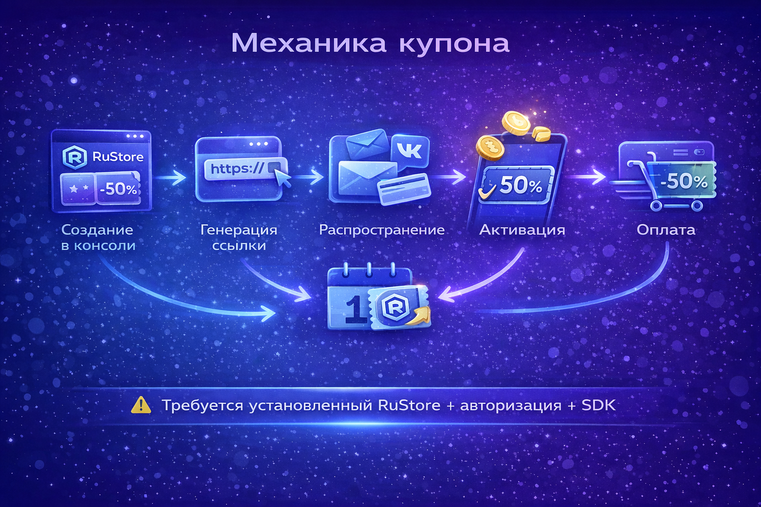Технически требуется актуальная версия SDK платежей RuStore. Критичная деталь для кросс-платформенных приложений с собственным биллингом: если приложение использует любую платёжную систему, кроме RuStore SDK, купоны будут недоступны полностью. Обходных путей нет, инструмент завязан на нативный платёжный стек платформы.