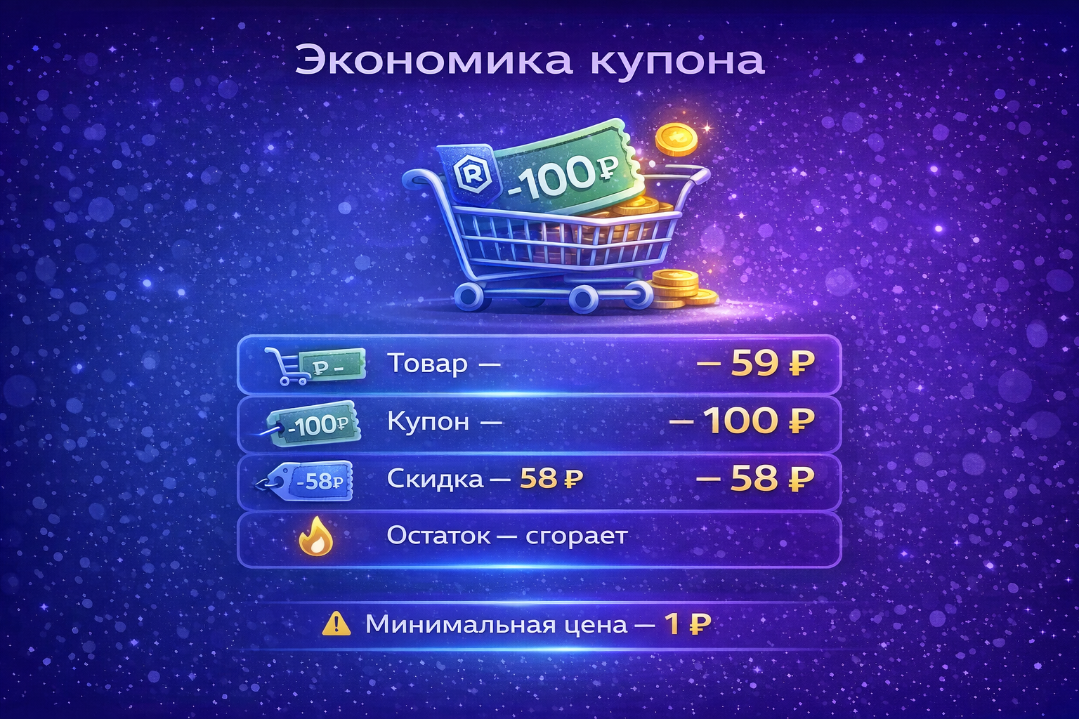 Минимальная стоимость покупки после применения купона 1 рубль. Если номинал купона превышает цену товара, остаток сгорает. Например, купон на 100 рублей к товару за 59 рублей даст скидку в 58 рублей, а не 100. Пользователь, который не прочитал условия, может почувствовать себя обманутым – это потенциальный источник негативных отзывов.