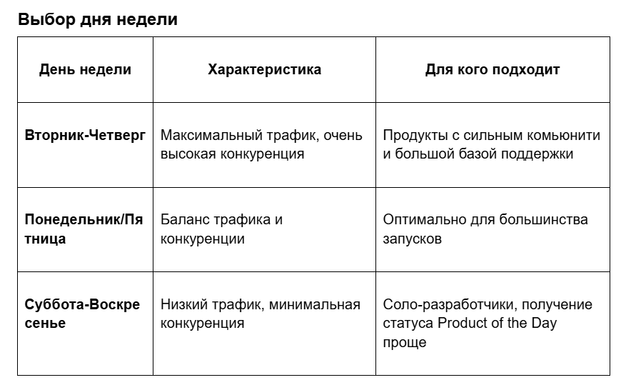 Решение: Для максимального результата стоит комбинировать сильную личную сеть контактов с выбором оптимального дня запуска.